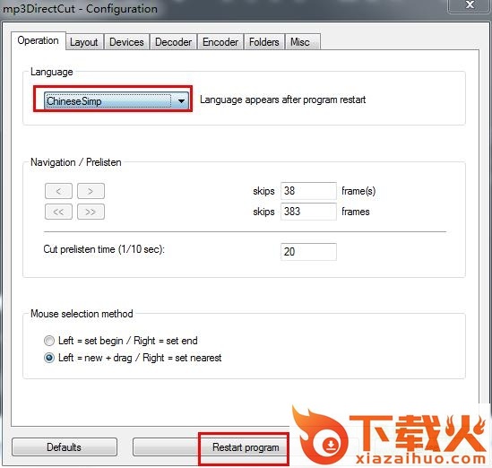 2.language处选择语言,选ChineseSimp,点击Restart program重启软件