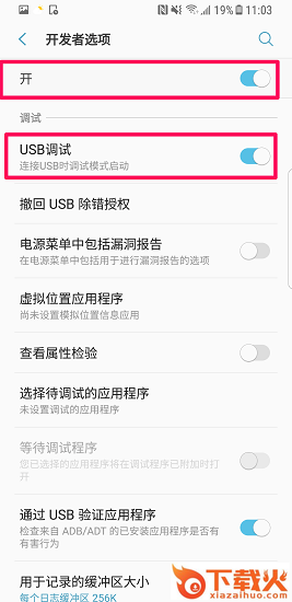 4.进入【开发者选项】,打开【开启开发者选项】和【USB调试】