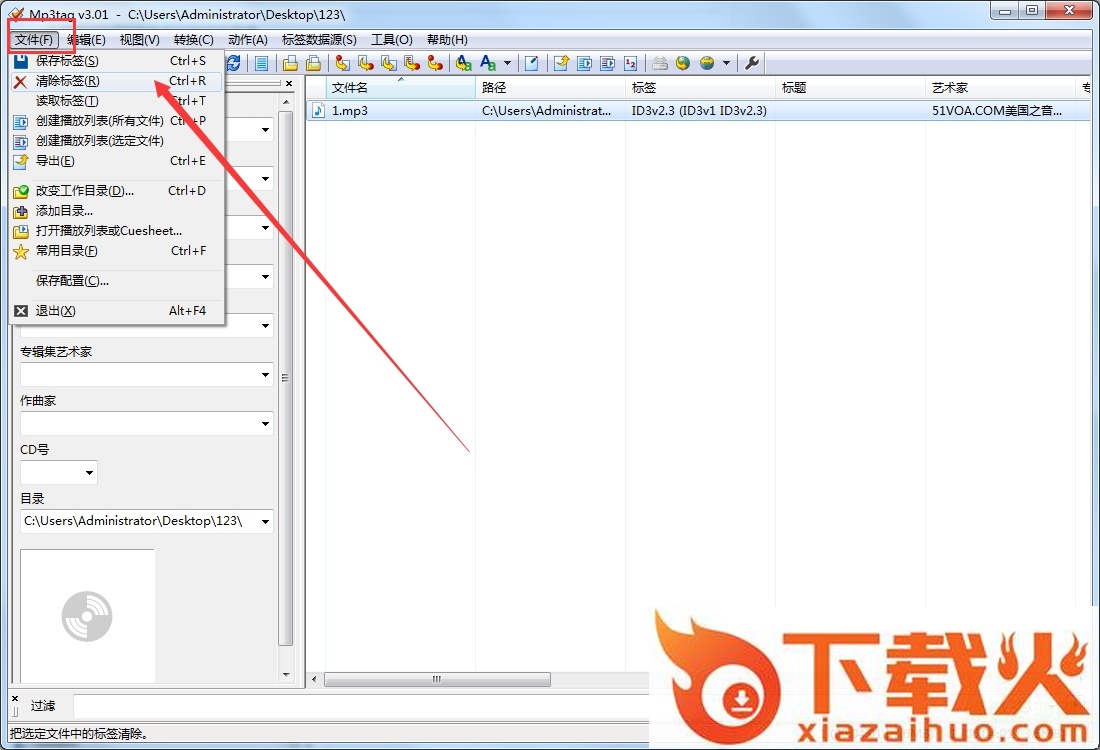 菜单中“文件“ - ”清除标签“,则把你所选择的MP3的标签清除。