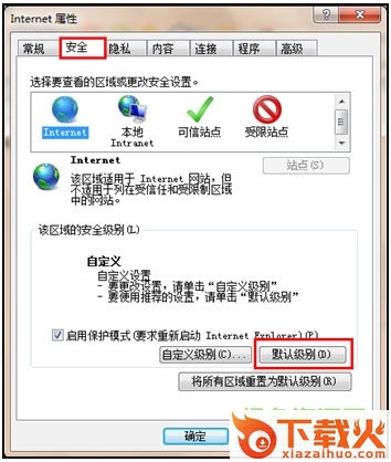 b. 切换到“安全”选项卡,点击“默认级别”按钮(若您的按钮是灰色不可点击,则您不需要修改这里或者被恶意软件劫持),IE 会自动开启 Java 脚本,如下图所示。