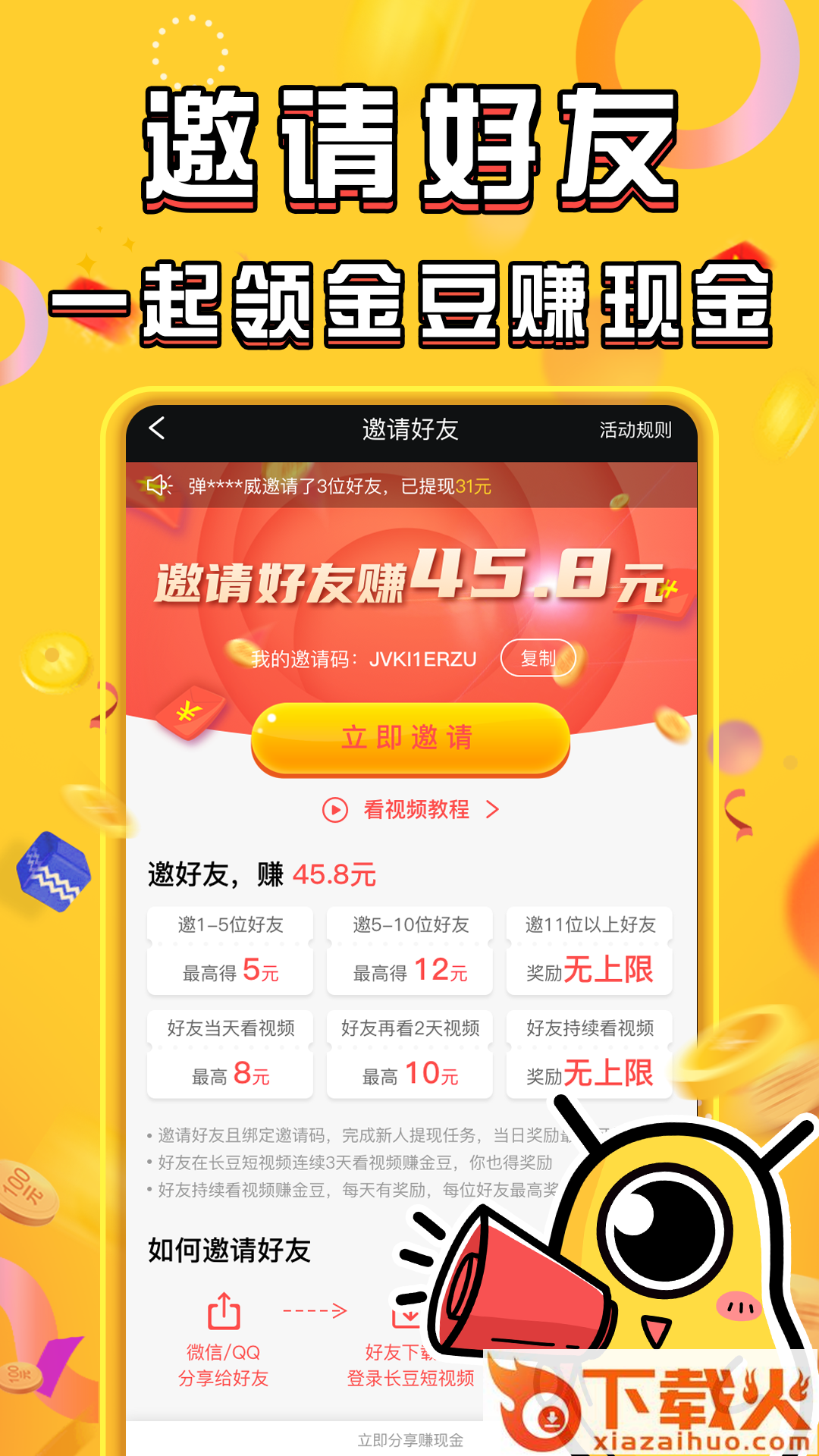 长豆短视频狂撒现金等你来,邀请好友一起玩更有大额现金奖励。