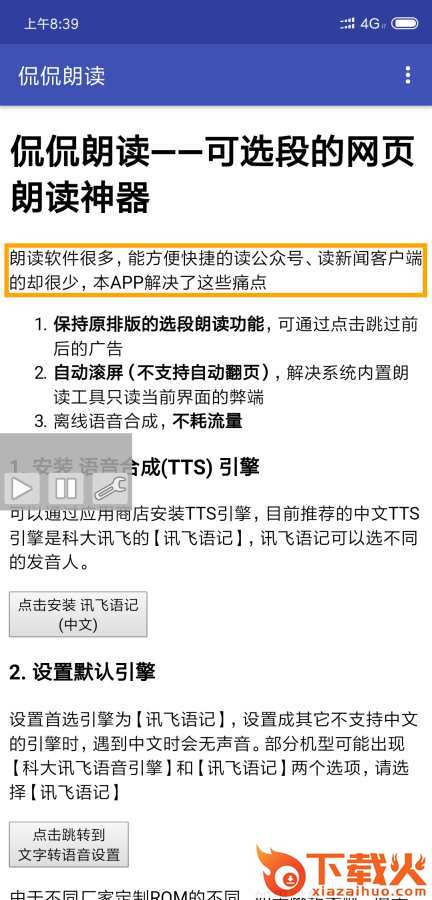 1. 保持原排版的选段朗读功能,可通过点击跳过前后的广告