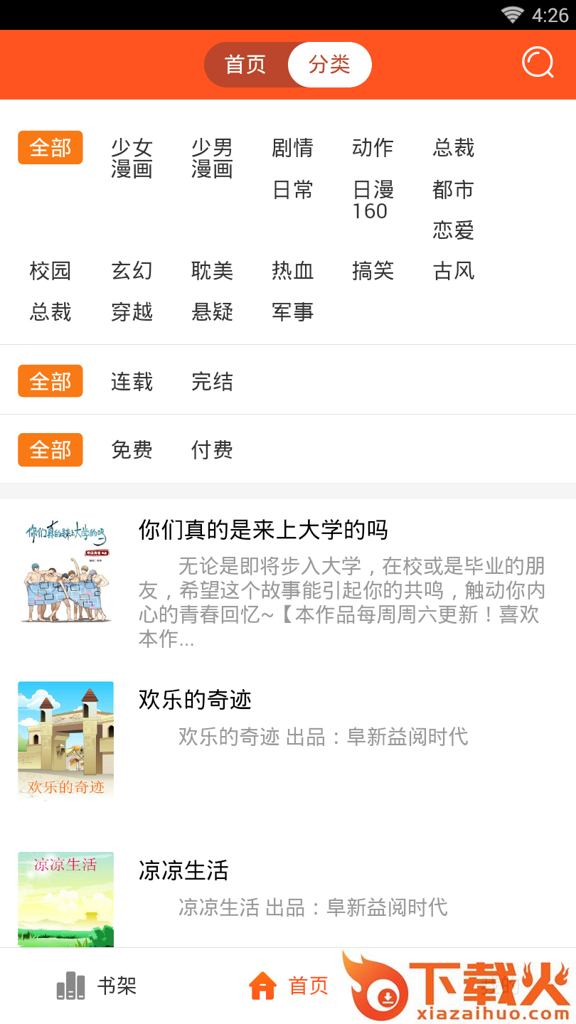 1、漫画分类非常全面,冒险、魔幻、搞笑、爱情、奇幻、热血、校园等