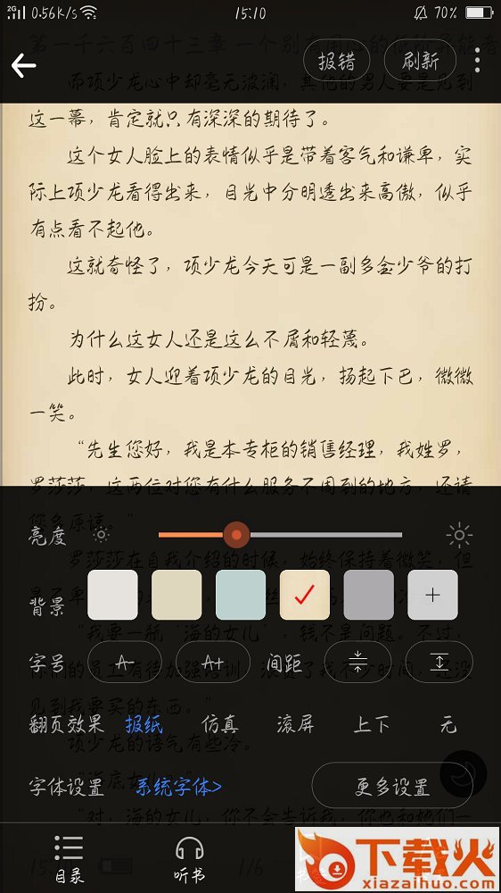 4、自定义阅读界面,设置翻页效果、背景、字号、亮度、字体等,还有听书功能解放你的眼睛。