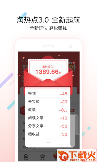 淘热点app是一款自阅文章和视频得现金收益的手机赚钱软件,软件拥有丰富的文章视频内容,单价高,提现快,可以让用户轻轻松松手机赚钱,觉得不错的朋友欢迎前来下载使用。...