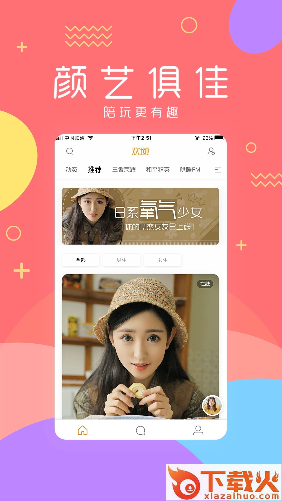 欢域app是一款综合游戏陪玩平台,这里爱玩王者吃鸡的她,爱玩休闲益智的她,爱陪玩上分的她,爱自拍爱分享的她,快来下载遇见那个她吧。