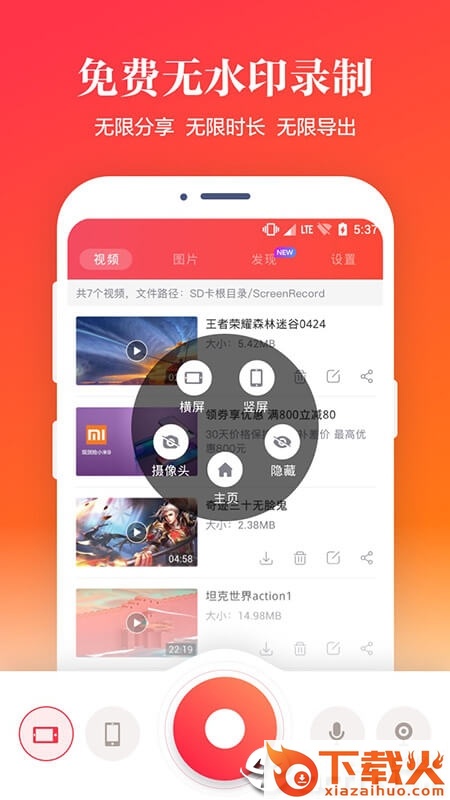 【录屏】:横屏、竖屏任意切换,同时可开启/隐藏悬浮窗录屏模式,可以摇一摇唤出悬浮窗控制录屏工具;