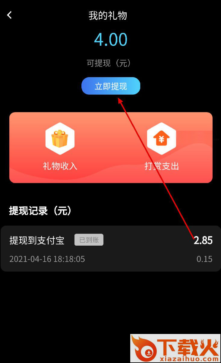 点击“我的”,点击右上角“三条杠”,点击“礼物”,点击“直接提现”,输入自己的支付宝账号和姓名,点击提现即可。