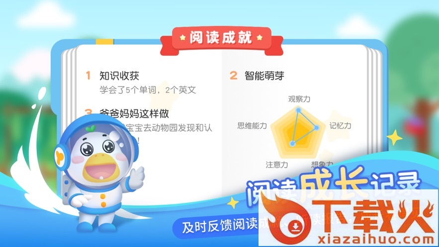 4、宝宝阅读成长记录:及时反馈每本书阅读成就:知识点、亲子阅读建议等。每月生成宝宝听读数据报告,成长看得见。