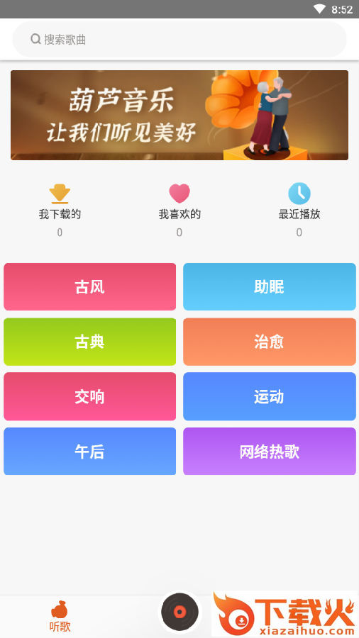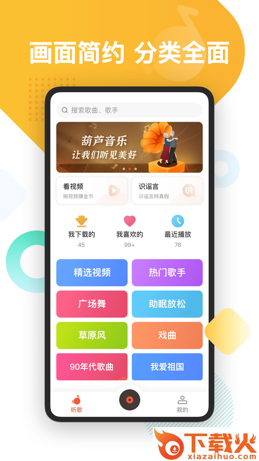 葫芦音乐,是一款专为叔叔阿姨定制的音乐软件,简约的画面,便捷的操作,海量的曲库,丰富的内容,边听边看,让音乐更有意义!