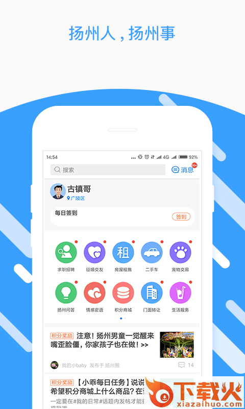 扬州圈app下载,为扬州的小伙伴提供丰富的生活服务和本地信息,通过扬州圈app既可以展示分享自己的生活故事,也可以找工作找房子等,了解一下!...