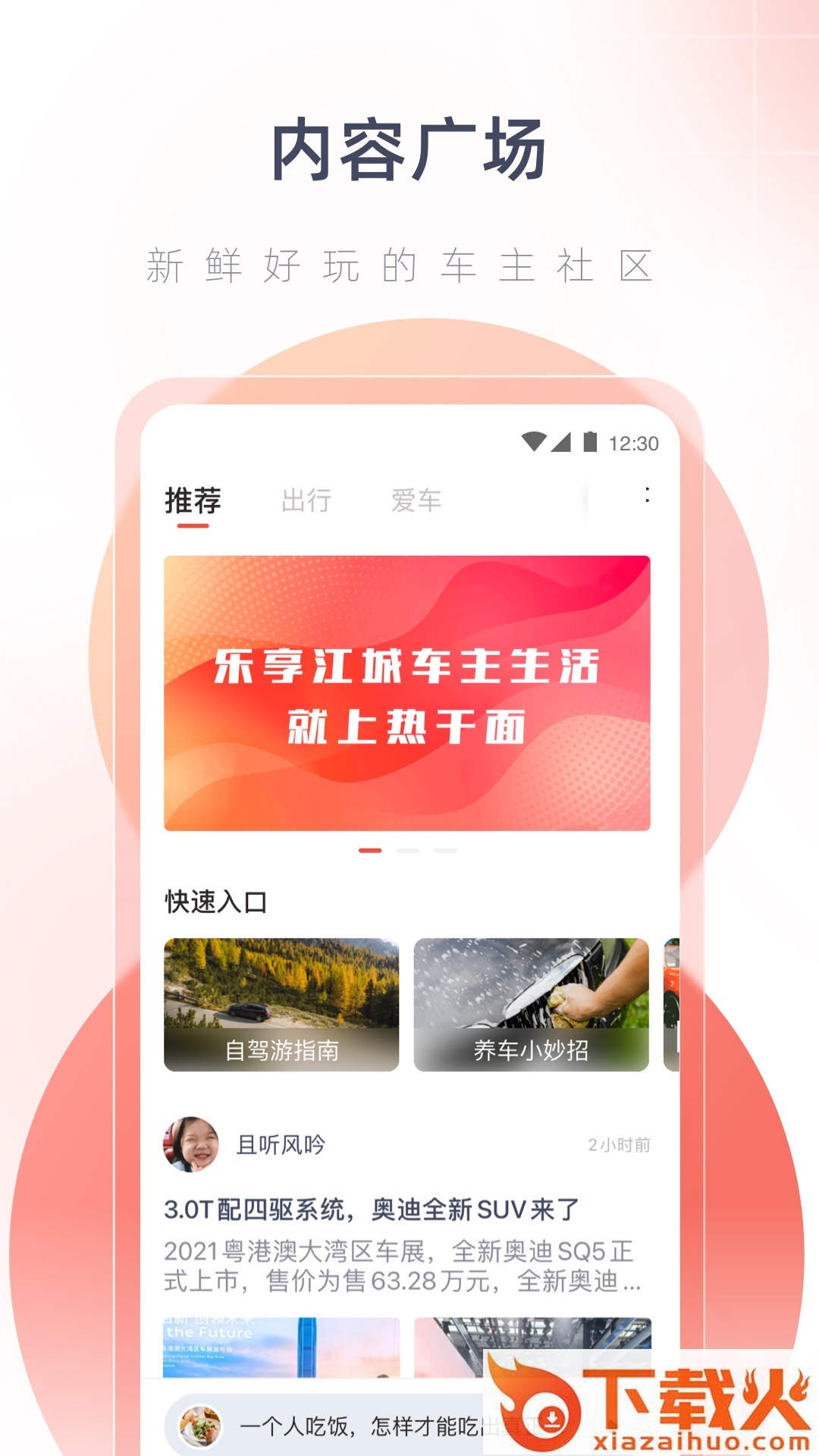 【内容广场】:车主权益聚集地,在这里可以随心发帖一起探讨最新的汽车资讯,新鲜有趣的内容和丰富的商品种类精准推送,买车、卖车、养车、周末自驾游各种品质车服,懂你所想,惊喜连连。