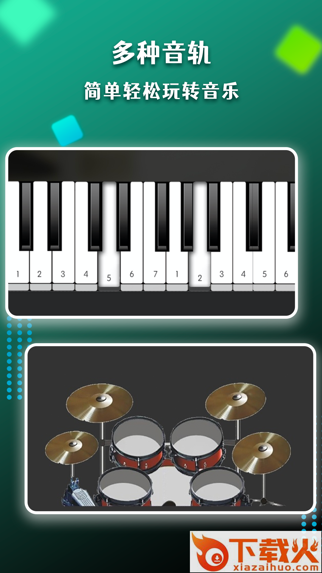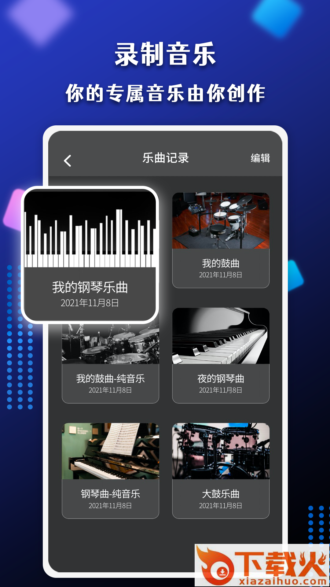 一款电子音乐制作软件。用户可以基于钢琴、架子鼓进行个性化演奏,演绎自己的节拍律动,同时可以录制音乐,重放演奏过程。