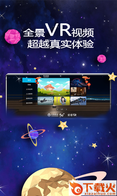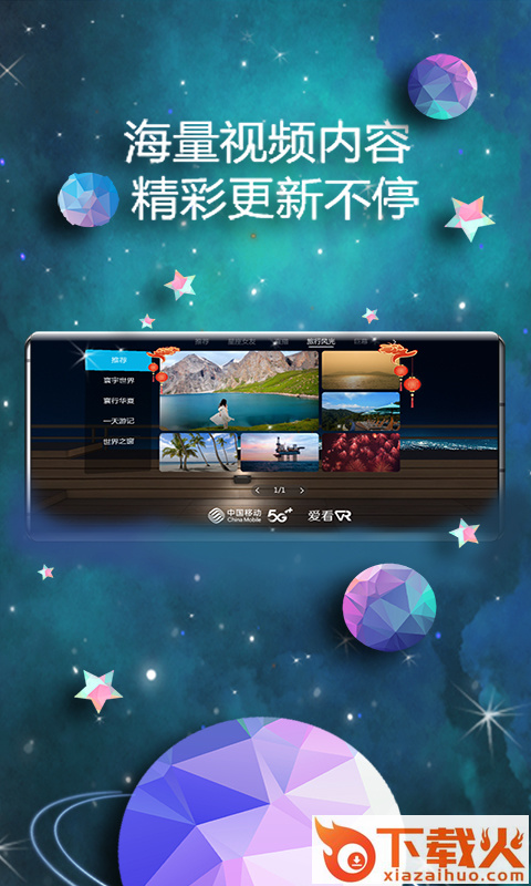 爱看VR是浙江移动精心打造的高品质虚拟现实客户端,汇聚海量VR视频,引领5G视听新革命,让前所未有的5G“视”界“浸”在你眼前!