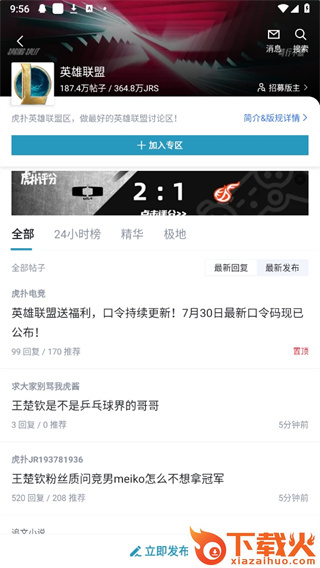 4、点击LOL专区,加入论坛,即可查看热门帖子,或者发帖、回复等,跟其他jr互动