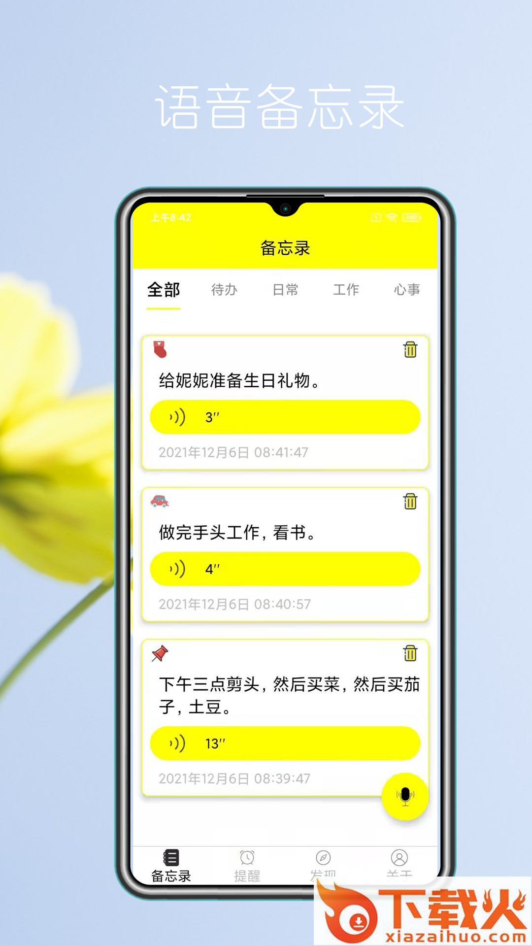 语音实时备忘录app下载,一款支持语音形式的多功能备忘工具,在语音实时备忘录app一键录音建立记事备忘主题,还可以语音转文字,有需要就来下载体验。