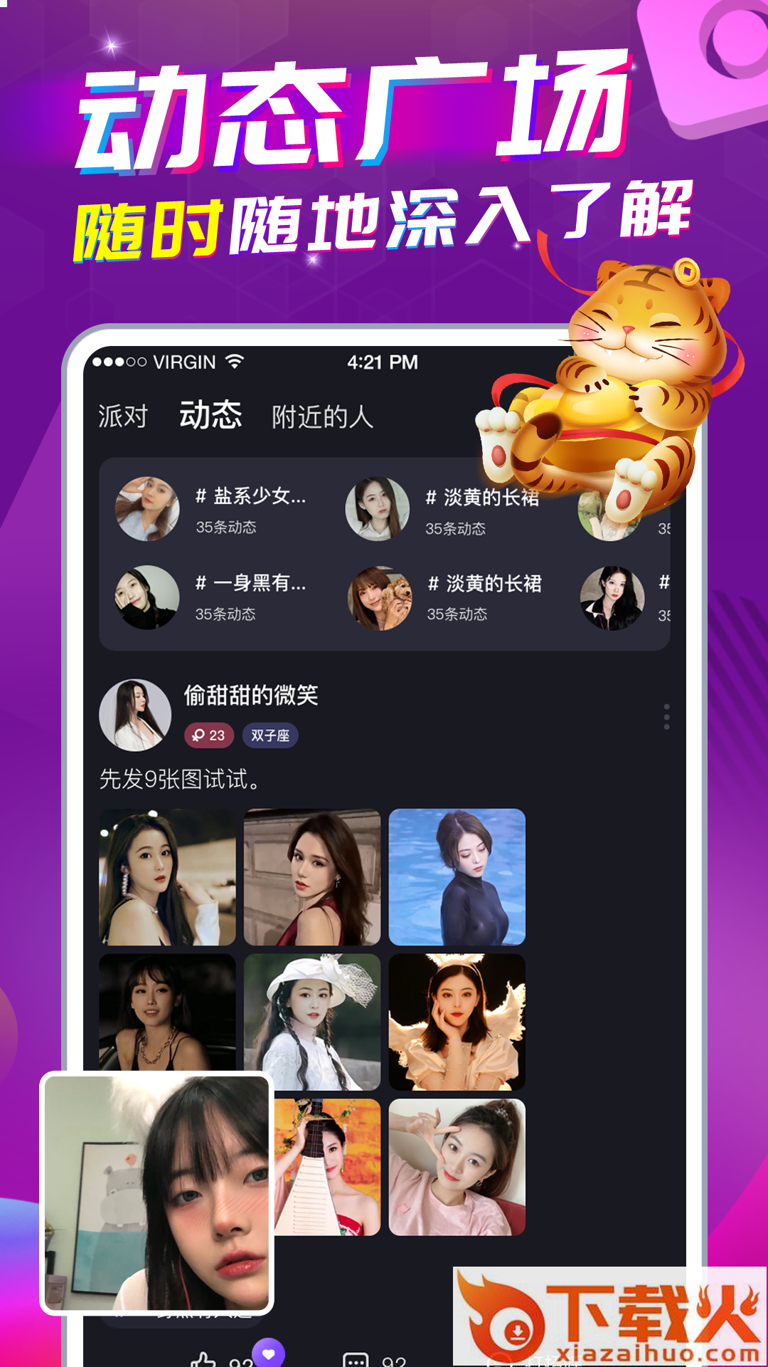 星遇直播App,真实交友视听盛宴;心动直播,高颜主播大展绝技;声控福利,连麦畅聊甜蜜互动;附近推荐,想见就见拒绝套路;动态广场,随时随地深入了解。