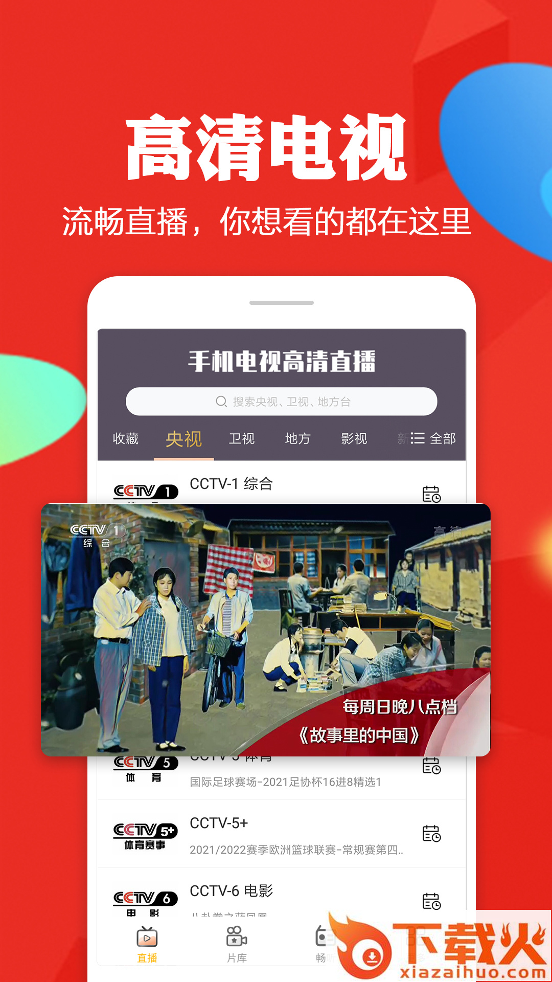 囊括cctv1、cctv6、cctv新闻、cctv3、cctv4、cctv5、cctv5+、央视频道、体育直播、实况足球、天下足球、中超、英超、欧冠、西甲、意甲、法甲、cba、nba、怀旧剧场、世界地理、兵器科技等热门央视影音视频,任何央视频道新闻生活资讯、新闻联播、焦点访谈、新闻直播间、地理中国、探索发现、天气预报、军事纪实、国家记忆、海峡两岸、直播港澳台等都可流畅高清观看。