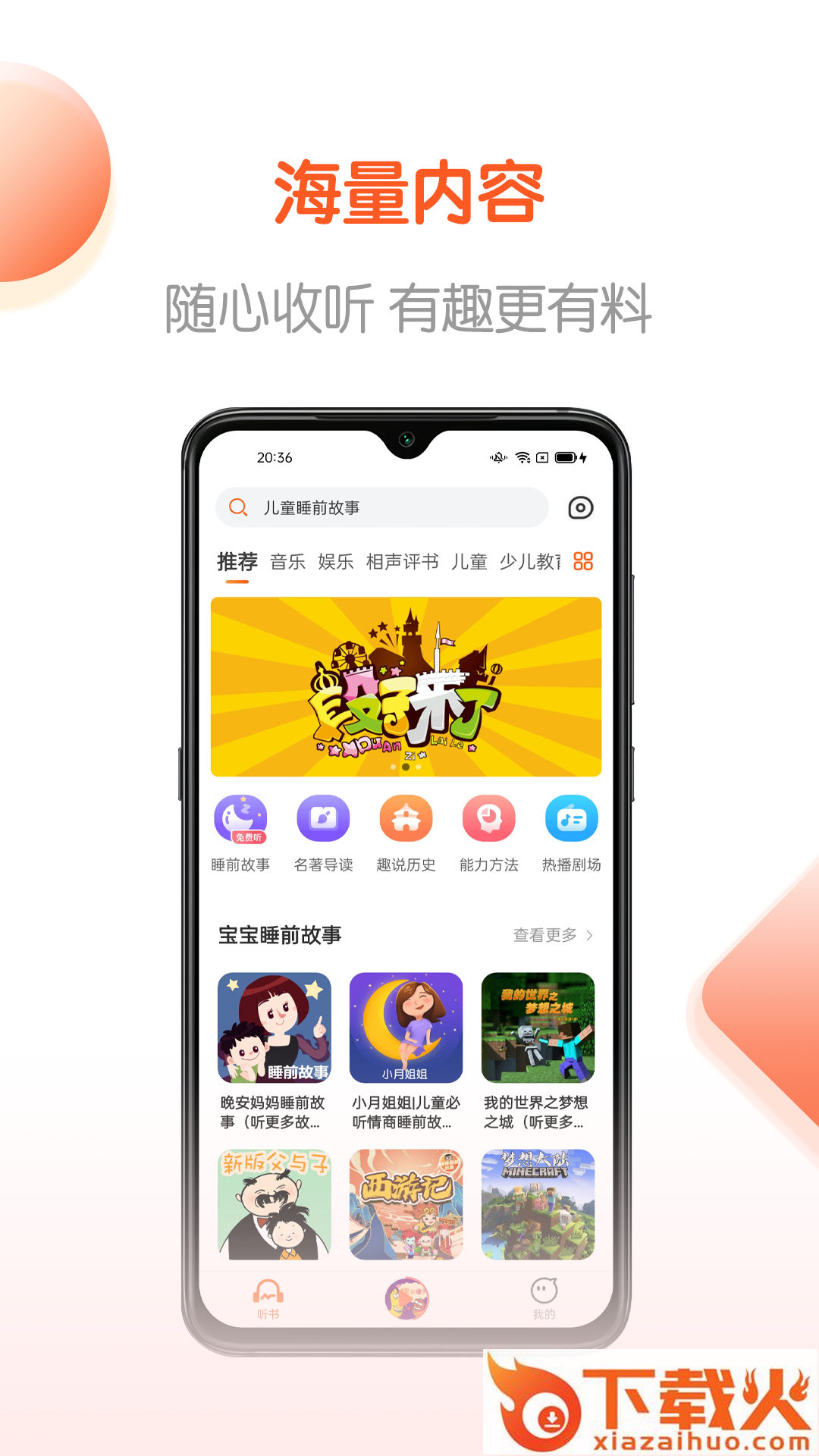 海量资源:儿童启蒙,娱乐解压,热点头条,人文历史,知名相声评书,电影解说,小语种学习,个人成长,名校公开课,商业财经,IT科技,时尚生活,传统戏曲等等海量资源免费畅听。