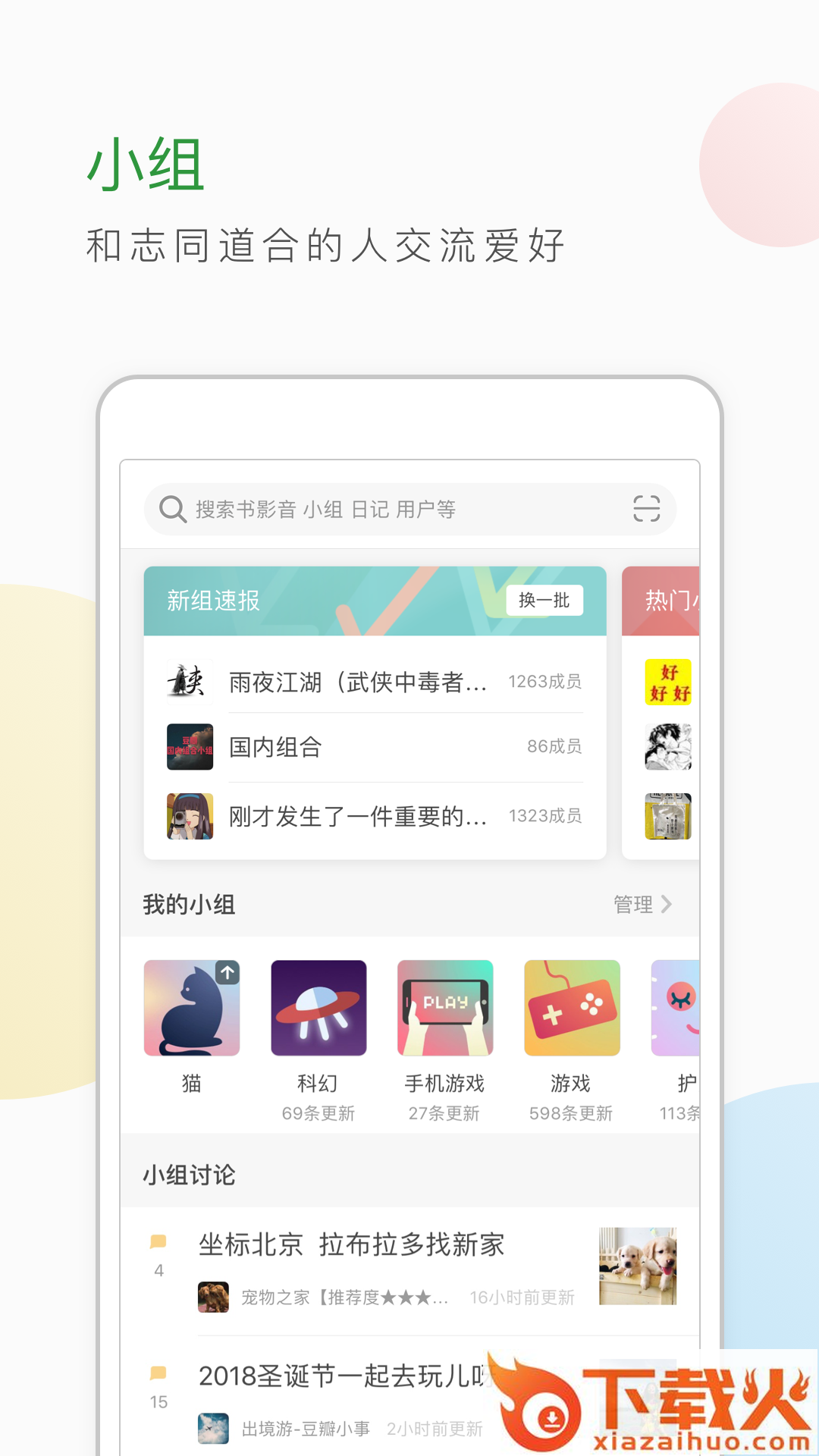 “小组”拥有难以置信的活力,帮助你与兴趣相投的人找到彼此,汇聚“遥远的相似性”。在这里,你将不断发现有趣的最新小组和时下热组,遇见与你一样特别的人。加入感兴趣的小组后,你可以随时与志同道合的人交流,共同讨论你们所爱好的人事物。