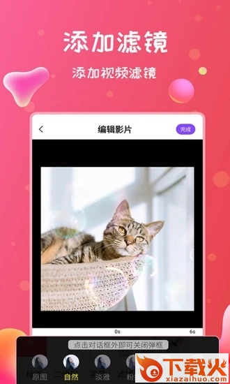 编辑特效:日系、复古、黑白、摩登、胶片等个性滤镜,动态文字、大片片头、趣味贴纸、真实音效素材。