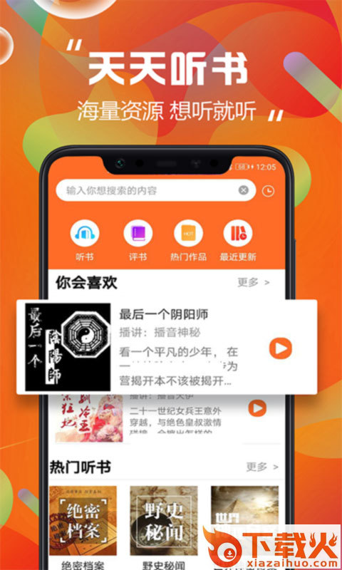 天天听书有海量热门有声听书资源、听有声小说大全、听相声评书、内容聚合了玄幻、武侠、言情、都市,校园等 多种类别有声、享受简单轻松的听书、精彩内容畅听不断!
