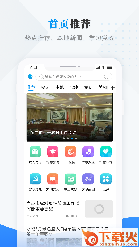 1、首页推荐:热点推荐、本地新闻、学习党政
