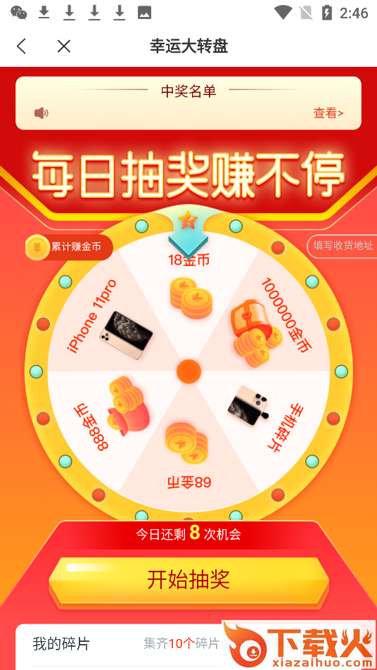 7、大转盘有概率获得 iphone11pro手机碎片,集齐10个碎片可免费领取 iphone11pro手机大奖。