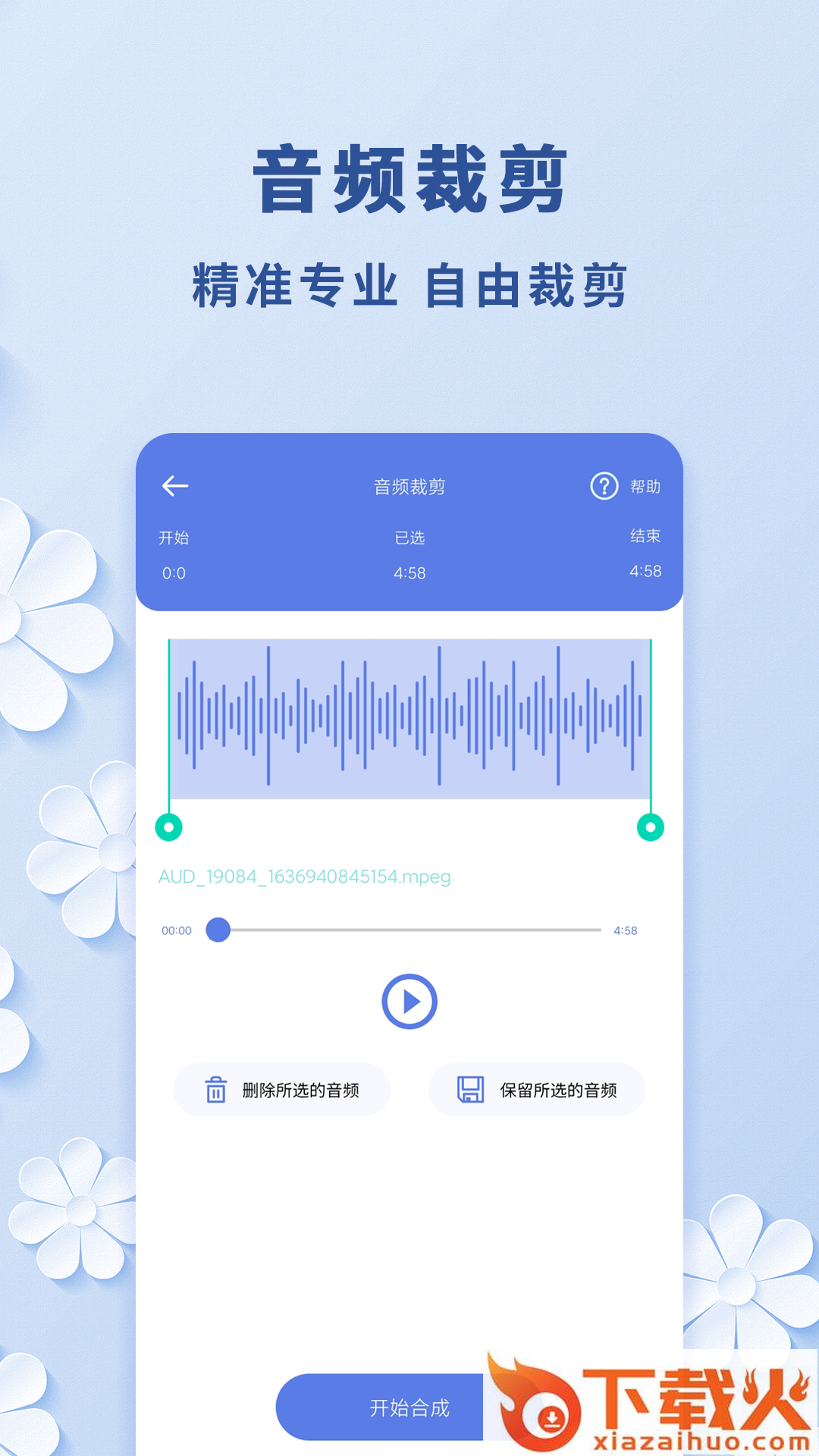 4,音频裁剪:可以对各类型的音频剪切制作,选择删除裁剪所选的音频或保留所选的音频