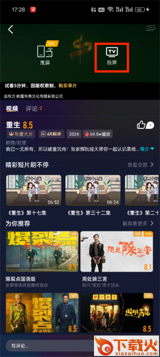 3、最后在这里点击【投屏】即可将视频投放到电视上播放;