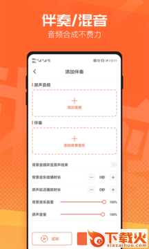 2. 混音、添加伴奏:将不同的音乐混合成一首音乐,可调节音乐音量,设置音乐出现时间。