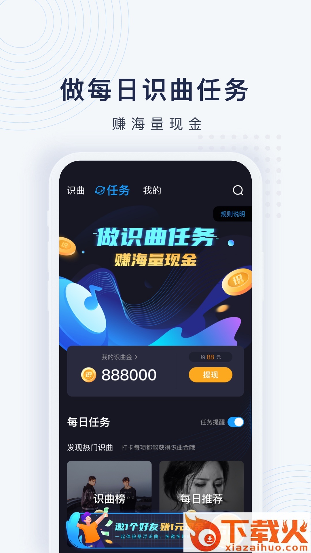 【识曲任务】每日做任务,发现抖音快手热门识曲,更有机会赚现金哦。