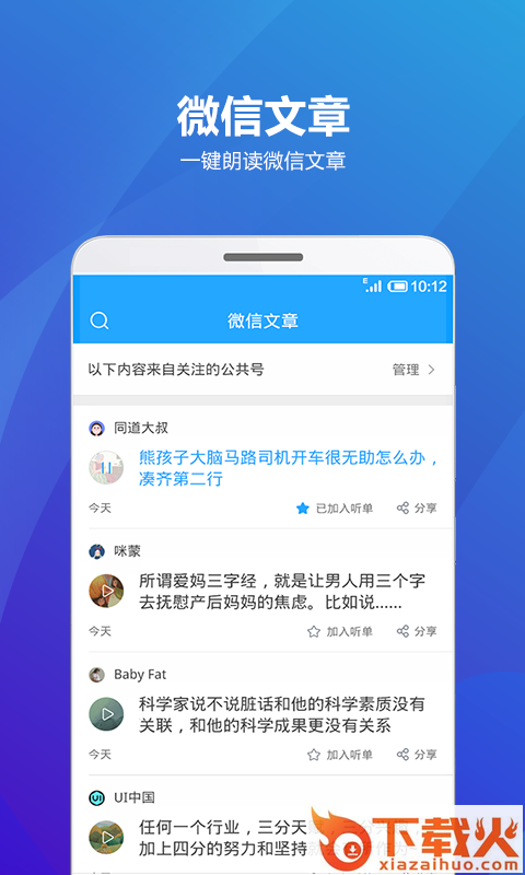 2、提供丰富优质微信号,只需一键订阅,任意文章随时加入听单,一键收听。