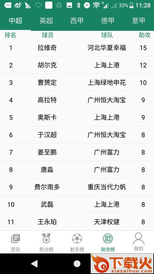 3、射手榜,助攻榜一目了然,中超,国家队,英超,意甲,德甲,法甲,欧冠,欧联,世预赛,各个球员信息一目了然。