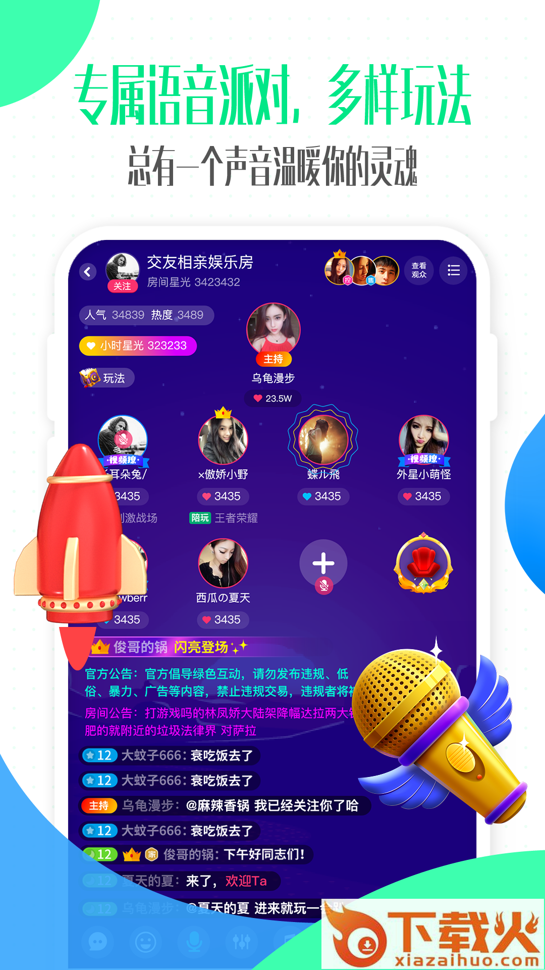 娱乐交友、歌手点单、情感电台…语音房24小时在线互动、美女声优能聊善逗会撒娇,多款女神陪你聊通宵,有颜有料速围观,从此深夜不孤单。