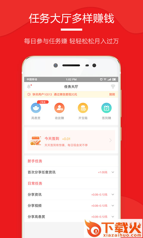 今天快讯安卓版下载,分享阅读赚取现金,今天快讯app拥有丰富的新闻资讯,用户不仅可以在这里看大更多有趣的事情,也可以通过分享来赚零花钱!