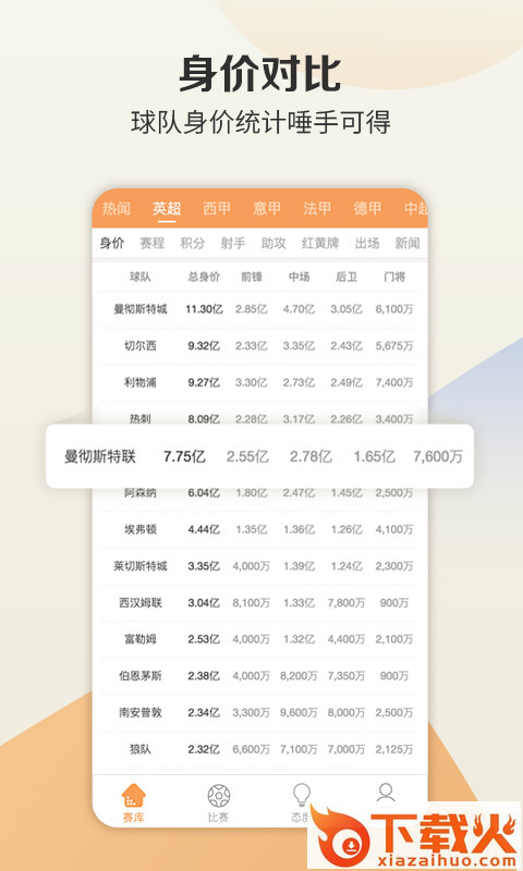 拥有热门联赛的数据,包含球队、球员身价数据,球员身价排行榜单,主客队阵容、赛事态度等。用户可以快速了解喜爱球队的各类比赛数据,即时的赛事新闻,为球迷们提供赛事前瞻,球队伤停情况、即时资讯及赛事。