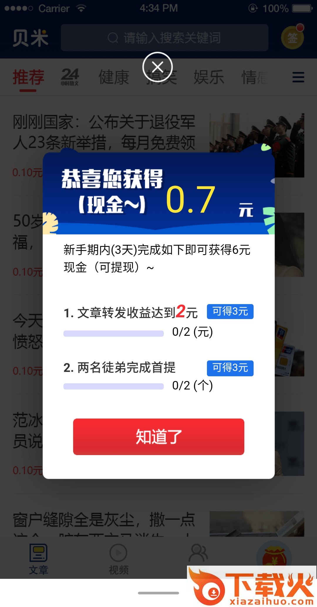 转发有效阅读0.12元,注册后三天完成新手任务奖励6元