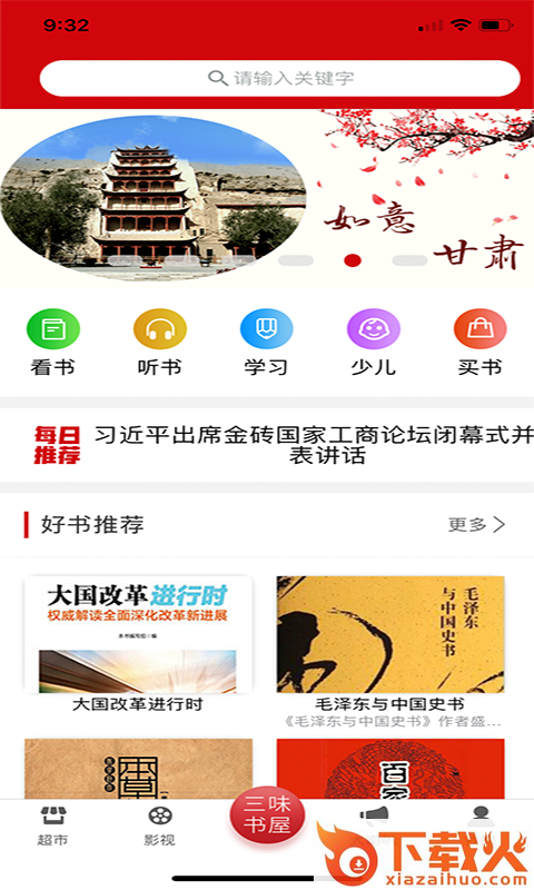 进入APP后,看到的三味书屋板块是百草园APP的主界面。由banner(版头)、看书、听书、学习、少儿、买书以及每日推荐、好书推荐,