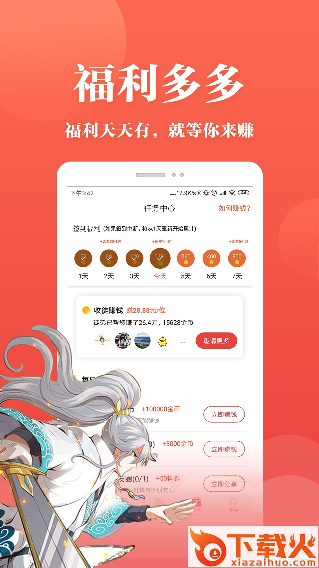 能赚钱的-任务中心,通过签到、收徒弟、邀好友、看漫画、写评论、看广告、玩游戏、晒收入、膜拜土豪等方式,每天赚取金币、获得徒弟金币分成,金币兑换现金,看漫画赚零花钱。