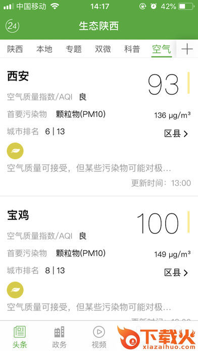 软件总共设有头条、陕西、本地、空气、专题、双微、科普、政务、视频、举报10个版块。
