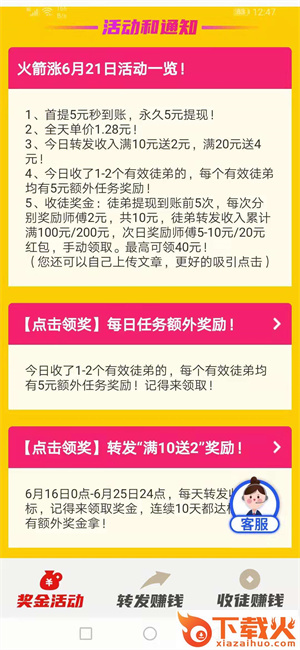 2、火箭看点转发平台不仅涨分速度极快,而且提现门槛也是非常低,同时还有非常多的福利活动,可以说是转客必做平台之一