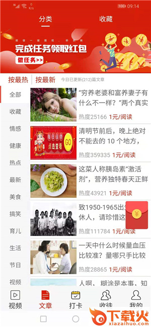2、登录成功后,点击“视频”或者“文章”频道转发任意文章或者视频到微信,被阅读后就有现金奖励