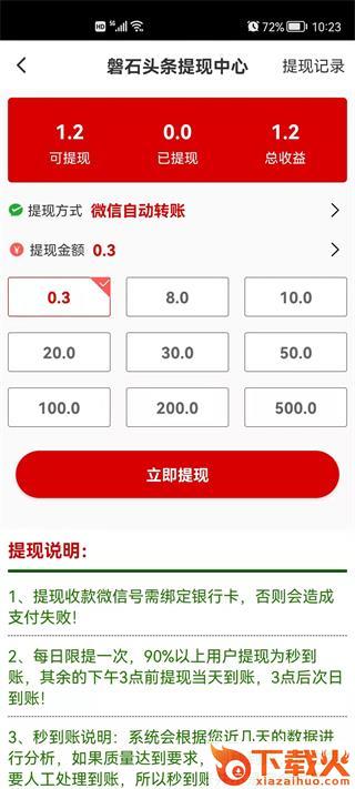 低门槛提现,首次0.3元提现,后续8元起,当天到账。