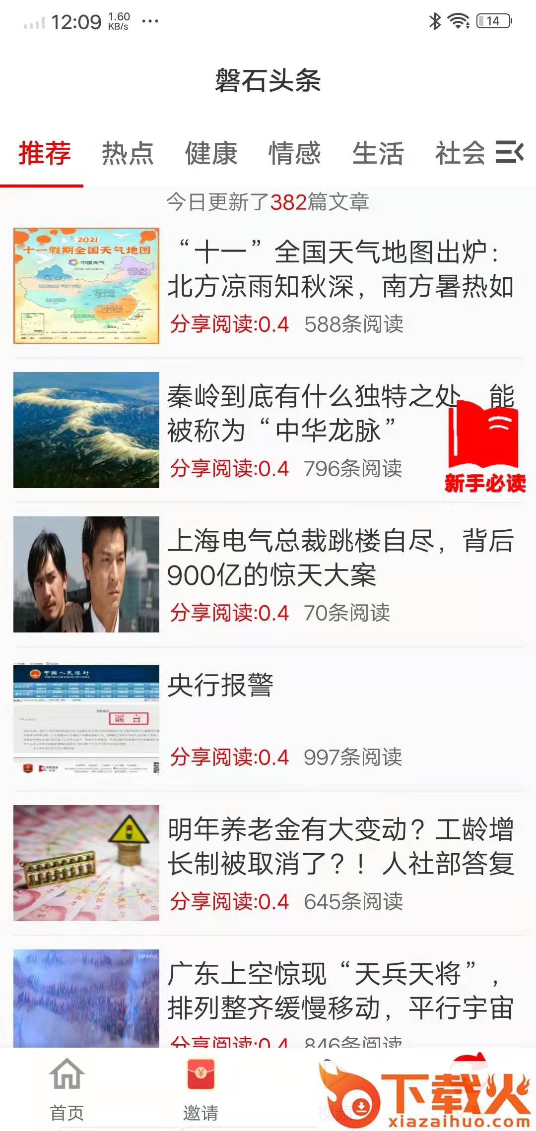 磐石头条APP是胡巴联盟全新推出的一款转发文章赚钱软件,于2021年10月5号上午10点推出。新人下载填写邀请码奖励1.2元,每天转发分享磐石头条上面的新闻资讯,只要获得他人阅读就有现金奖励,新上线涨分速度快,感兴趣的朋友快来下载磐石头条APP试试吧!