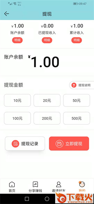 2、在极火网APP上赚取的奖励满10元可提现,申请提现后24小时内到账