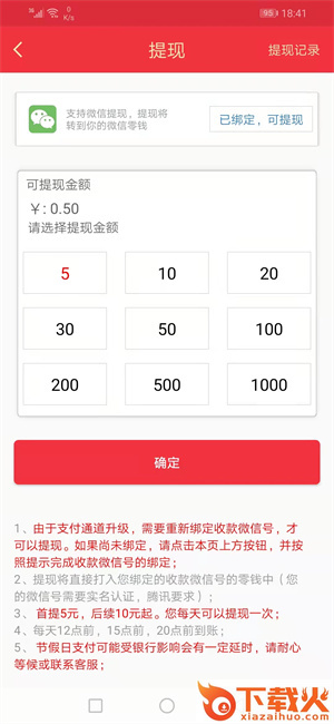 2、永久满5元可申请提现,申请提现后24小时到账,每天可提一次