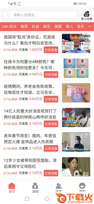 1、点击寅虎宝app内“转发”频道任选一篇文章转发到微信群或者朋友圈,只要有人点击阅读你就能获得现金奖励,阅读的人数越多,你的收益也就越高