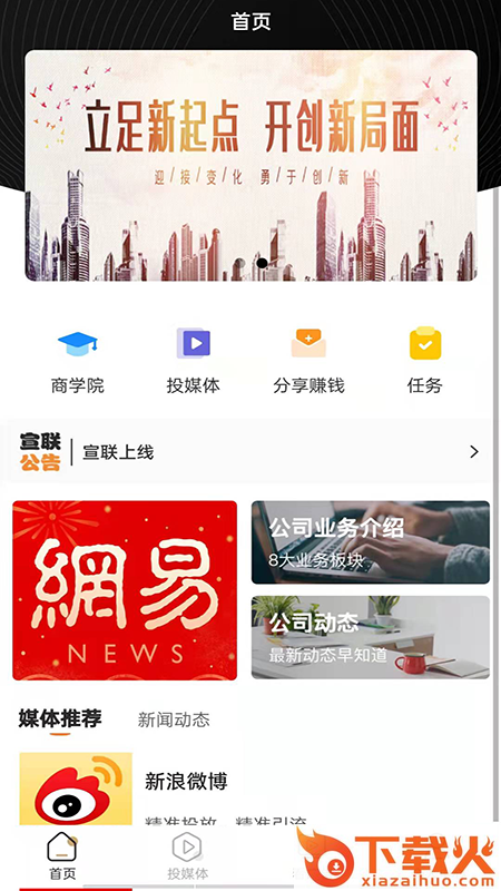 宣传联盟App,提供了商学院、头媒体、分享赚钱、做任务、看广告等服务,是一款为商家提供的优质的广告投放服务平台,以低廉的价格为广大用户提供便利的服务。