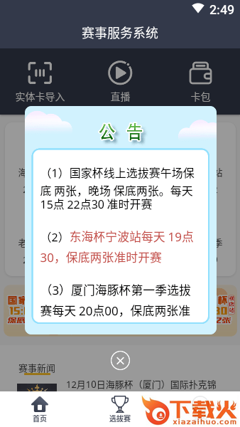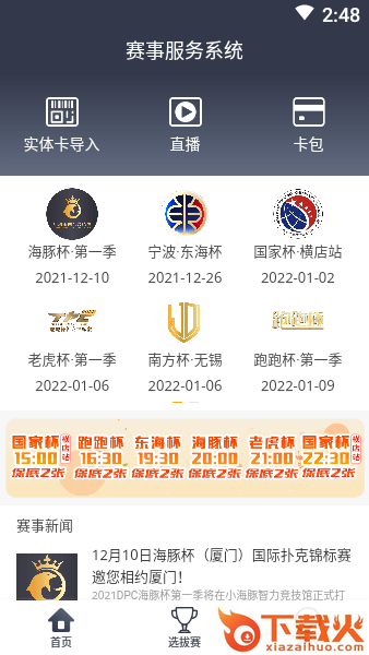 中趣赛事服务安卓版为您提供专业的赛事资讯内容,您可以在这里查看各类比赛的最新比赛世界,方便您及时的预约观看视频直播,此外还有实体卡导入和卡包功能等你来体验!